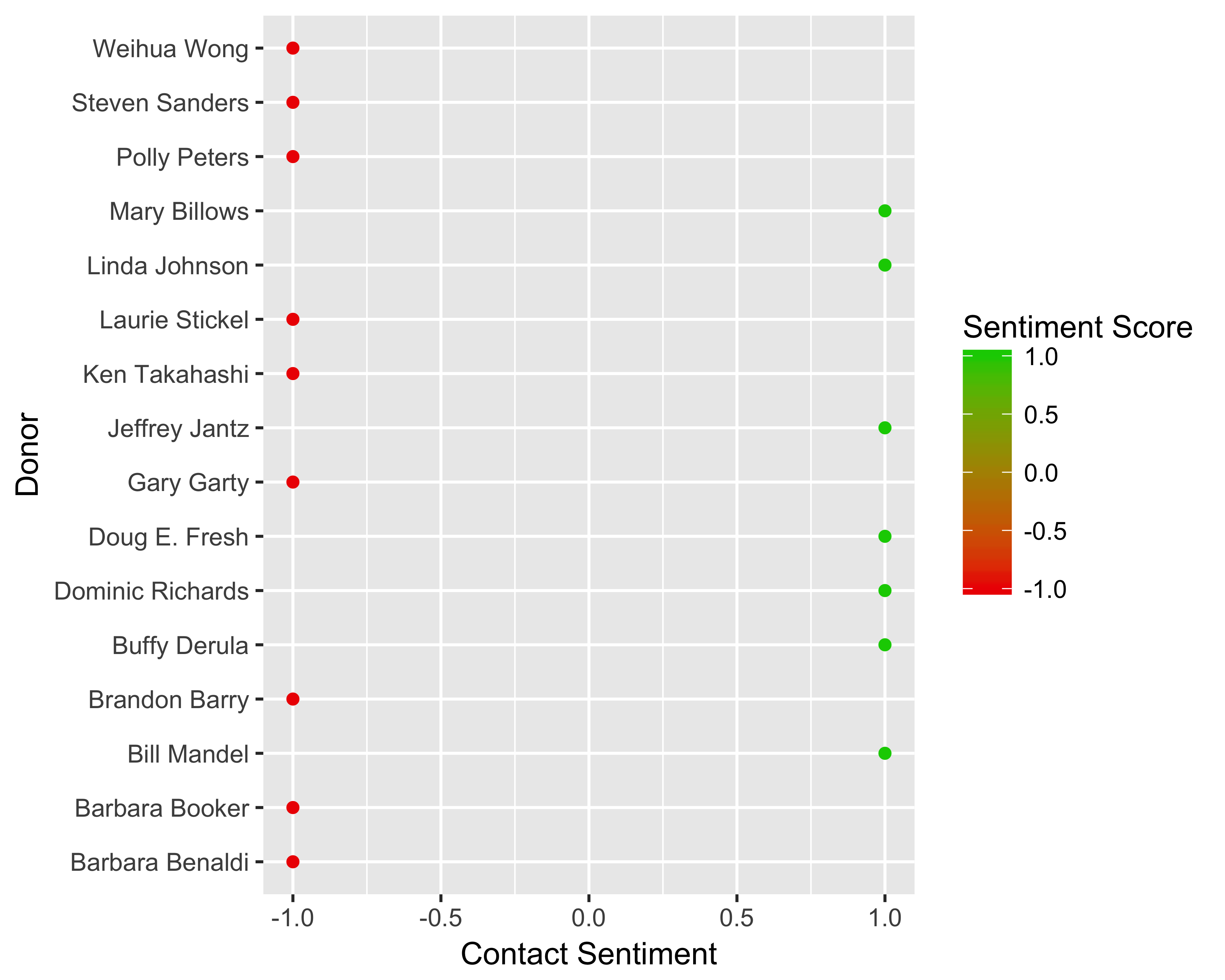 p + xlab("Contact Sentiment") + ylab("Donor")